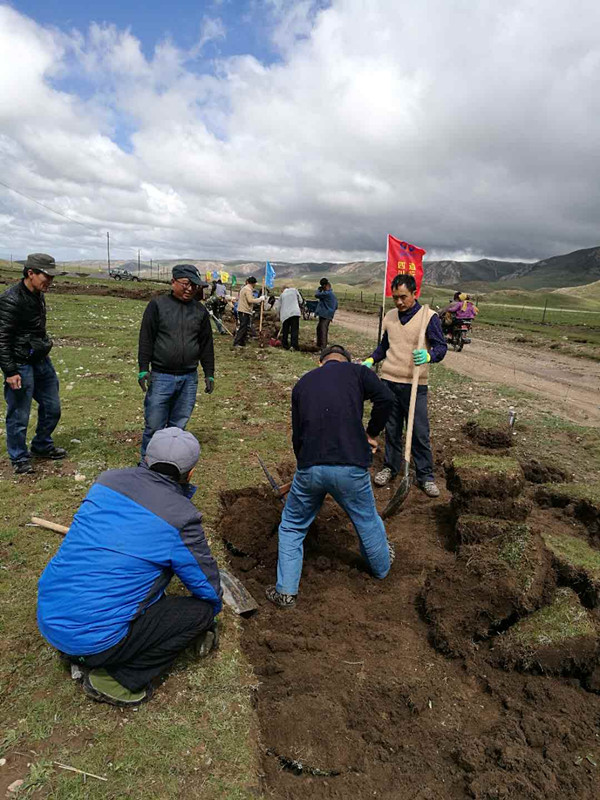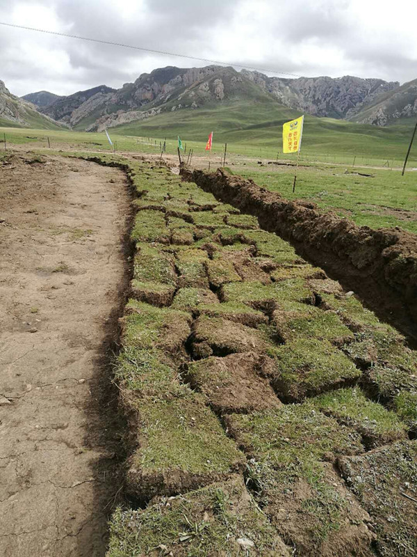 綠色工程作為唐花路建設(shè)的重中之重,在綠化施工方面,指揮部采用就近移栽的方式,及時(shí)將紅線內(nèi)和臨時(shí)用地的草甸按規(guī)范移植至道路邊坡,盡量保留自然的原貌,為了避免施工機(jī)械直接碾壓稀少的草甸,就近利用空地堆放揭開的草墊,并在堆放點(diǎn)設(shè)置標(biāo)示、標(biāo)牌,及時(shí)灑水養(yǎng)護(hù),有效保證草墊的存活率,目前移栽的草墊綠化率和存活率均達(dá)到90%以上。公路邊坡的恢復(fù)、綠化工作截至2018年7月底已完成 90%,11月底將全部完成。