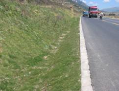 全線漿砌片石、砼邊溝、排水溝的原有設計,既增加了工程造價,又不利于公路與周邊環(huán)境的自然天成。為此,省道216\217理亞路指揮部、設計院等多次積極與參建單位針對該項目特點進行研究探索并實地踏勘,確定了在原水溝以下加設縱向盲溝達到排水目的,在除設置有上擋的段落保留砼邊溝外,其余段落均設置成淺蝶形土溝的設計,并在其上鋪設草皮,以減少人工痕跡,讓公路自然天成,與周圍環(huán)境渾然一體。