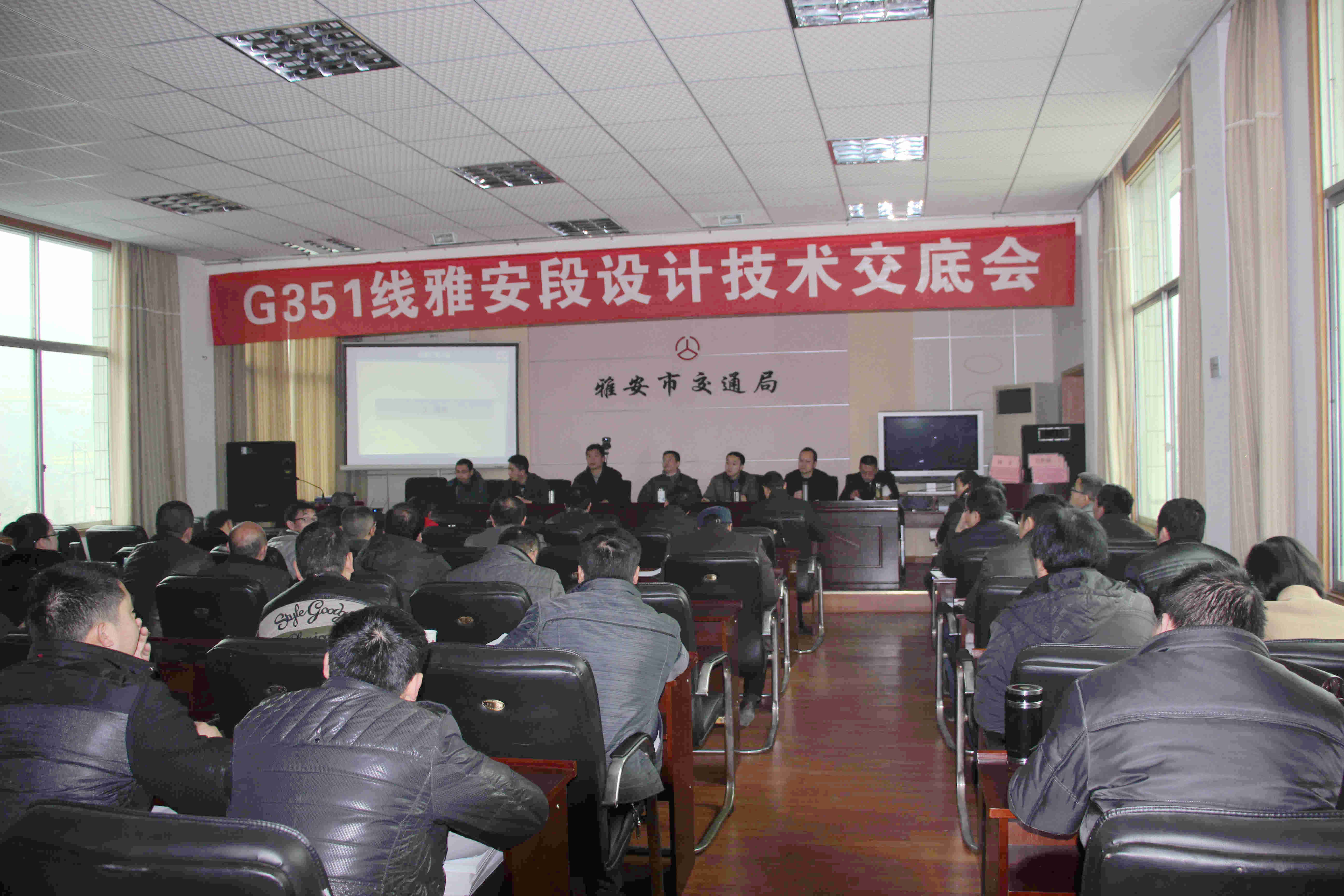 2014年2月25日上午,G351線雅安段設計技術交底會在雅安市交通運輸局四樓會議室順利召開。會議由興蜀公司G351線雅安段指揮部副指揮長潘華主持,四川省公路設計院后期服務中心主任林順、總工辦馬洪生一行、雅安市交通災后重建工作組工程部長趙飛勇以及G351線各標段施工單位、監(jiān)理單位參會。