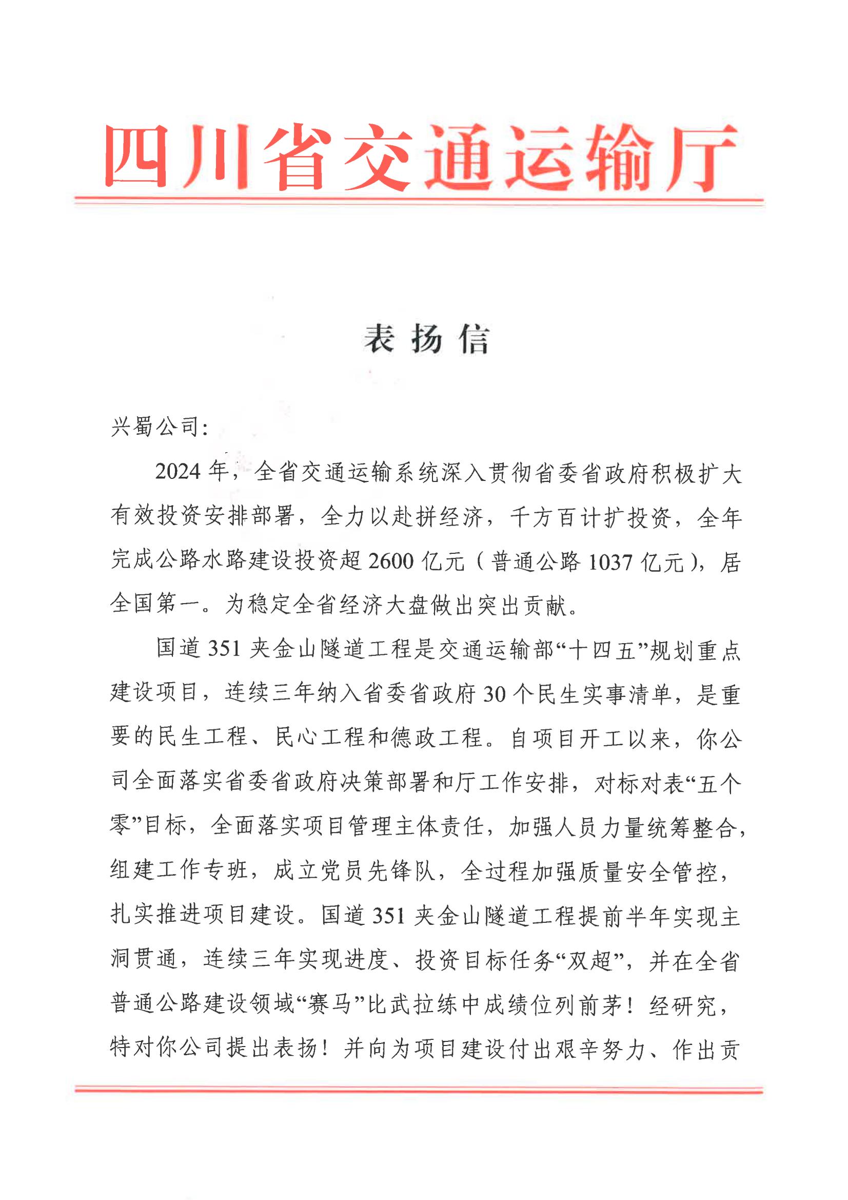 近日,我公司收到四川省交通運(yùn)輸廳發(fā)來的表揚(yáng)信,對國道351夾金山隧道工程提前半年實(shí)現(xiàn)主洞貫通,以及連續(xù)三年超額完成進(jìn)度和投資目標(biāo)的優(yōu)異成績給予高度評價,并對全體參建人員的辛勤付出表示衷心感謝。