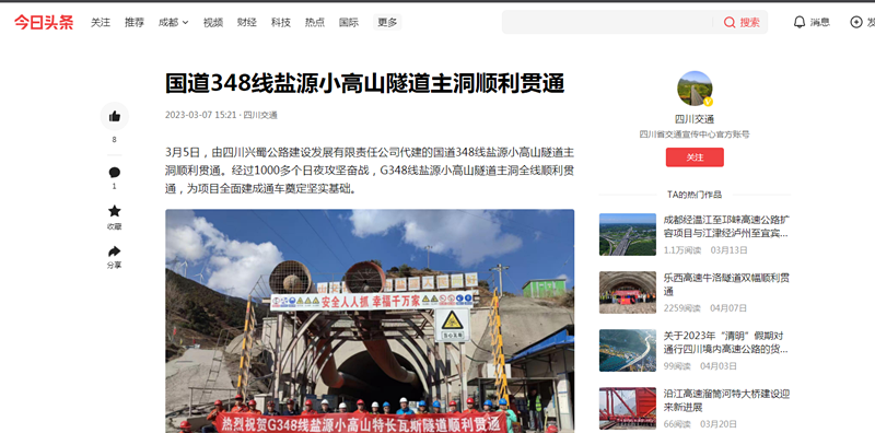 3月5日,由四川興蜀公路建設發(fā)展有限責任公司代建的國道348線鹽源小高山隧道主洞順利貫通。經(jīng)過1000多個日夜攻堅奮戰(zhàn),G348線鹽源小高山隧道主洞全線順利貫通,為項目全面建成通車奠定堅實基礎。