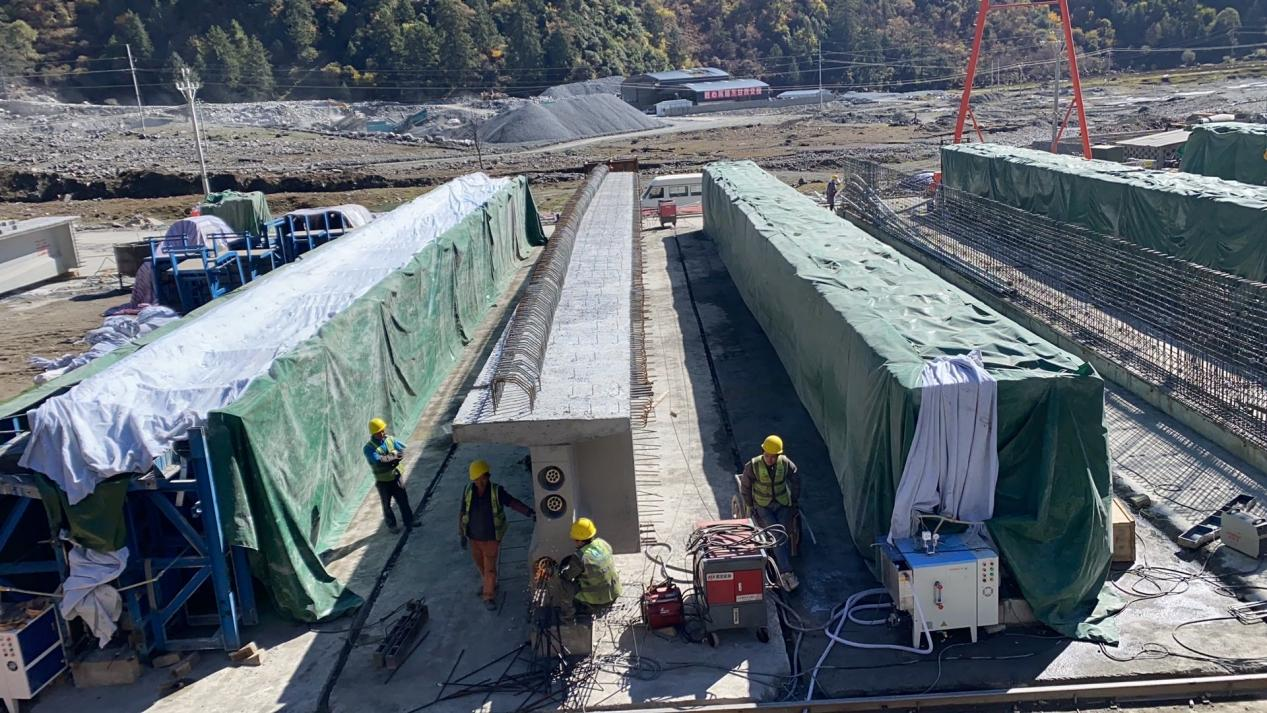 進(jìn)入冬季后,興蜀公司代建管理的國(guó)道549線九石路指揮部根據(jù)項(xiàng)目實(shí)際情況,合理部署冬季施工方案,全力推動(dòng)工程建設(shè)進(jìn)度。一是對(duì)冬季施工中混凝土外加劑如減水劑、防凍劑進(jìn)行現(xiàn)場(chǎng)查驗(yàn),確保質(zhì)量;二是對(duì)砂石料提前進(jìn)行覆蓋保溫,避免溫度過(guò)低影響混凝土拌和質(zhì)量;三是對(duì)水進(jìn)行加熱,檢測(cè)當(dāng)日混凝土出盤(pán)溫度,同時(shí)提高混凝土的澆筑速度,做好入模溫度控制;四是對(duì)預(yù)制梁重點(diǎn)采用蒸汽恒溫養(yǎng)護(hù)、搭設(shè)暖棚、棉被及時(shí)包裹覆蓋,加強(qiáng)混凝土保溫、測(cè)溫、養(yǎng)護(hù)工作。通過(guò)加強(qiáng)與氣象、水利、自然資源等部門(mén)的信息溝通,及時(shí)掌握并傳遞災(zāi)害性天氣預(yù)報(bào)預(yù)警信息,多措并舉,確保冬季施工質(zhì)量,穩(wěn)步推進(jìn)項(xiàng)目建設(shè)。
