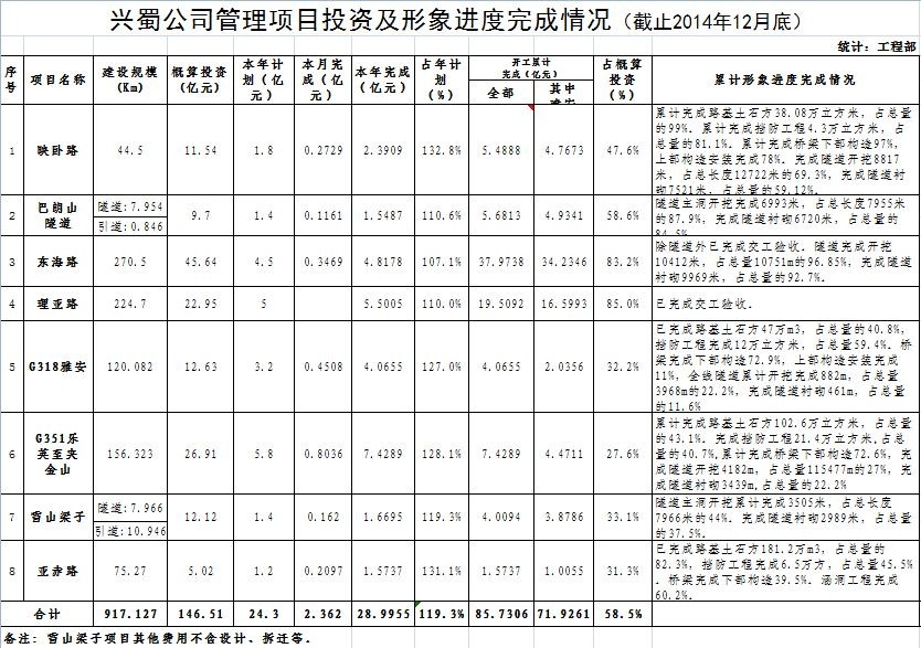 公司管理項目投資及形象進度完成情況(截止2014年12月底)