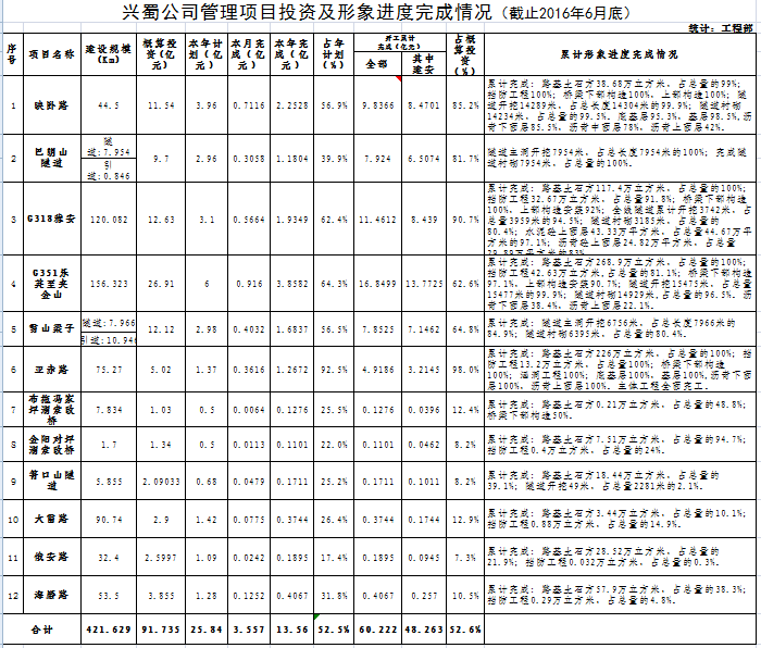 興蜀公司管理項(xiàng)目投資及形象進(jìn)度完成情況(截止2016年6月底)