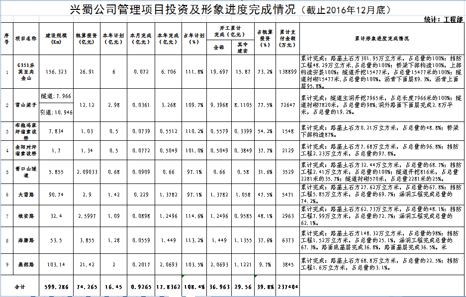 興蜀公司管理項(xiàng)目投資及形象進(jìn)度完成情況(截止2016年12月底)