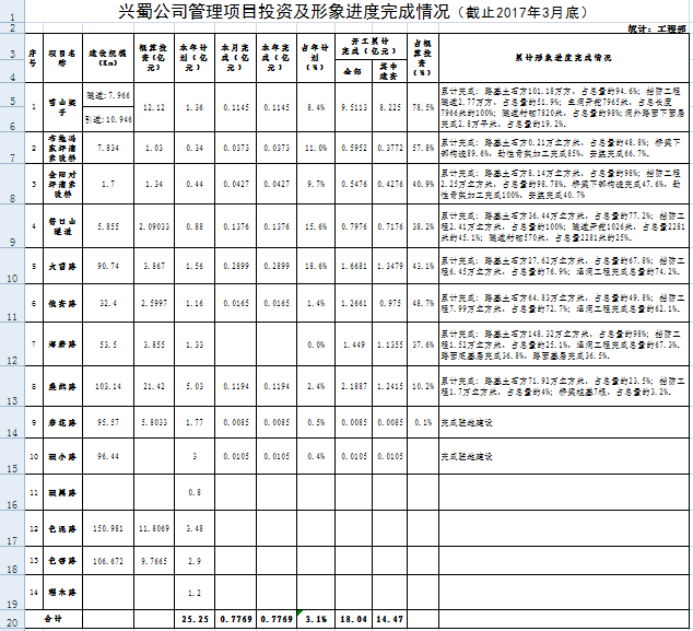 興蜀公司管理項(xiàng)目投資及形象進(jìn)度完成情況(截止2017年3月底)