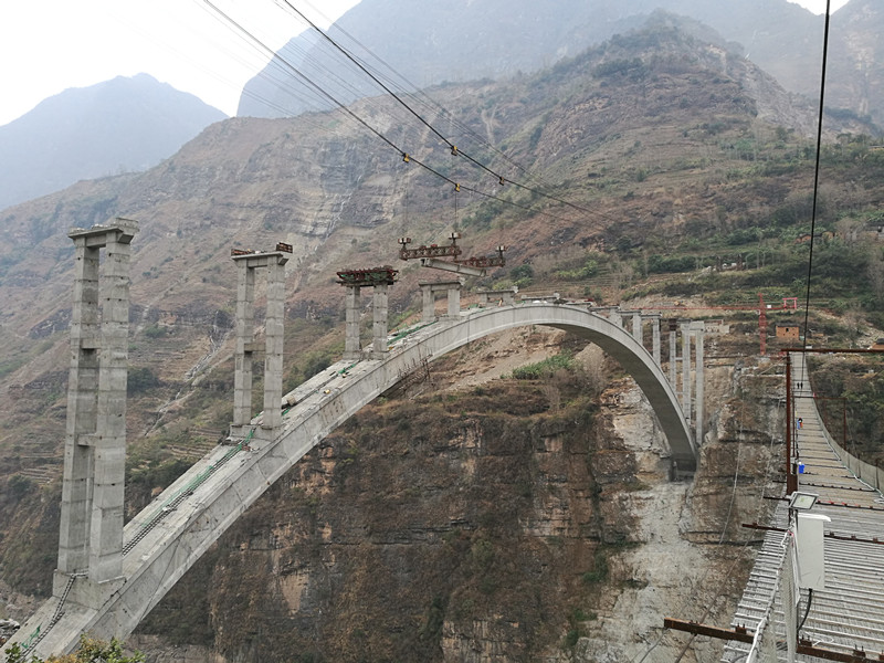 布拖馮家坪金沙江溜索改橋項(xiàng)目坐落在“亞洲第一高溜”鸚哥溜索下游500米的金沙江上,距金沙江水平面276米,橋梁基礎(chǔ)兩岸山體坡角為70~80°,地勢(shì)十分險(xiǎn)要。加之峽谷季風(fēng)性氣候,風(fēng)力時(shí)常達(dá)到七八級(jí),使箱梁吊裝要同時(shí)經(jīng)受住高空、大風(fēng)的多重考驗(yàn)。為確保箱梁工作安全進(jìn)行,興蜀公司布拖金沙江溜索改橋指揮部多次組織各參建單位討論吊裝安全方案,對(duì)吊裝時(shí)間、運(yùn)梁線路、臨時(shí)支座安裝、履帶吊站位、箱梁運(yùn)行、落梁等工作做了詳細(xì)的安排部署,保證吊裝工作始終可控。拱上箱梁吊裝工作計(jì)劃在2月底前結(jié)束。