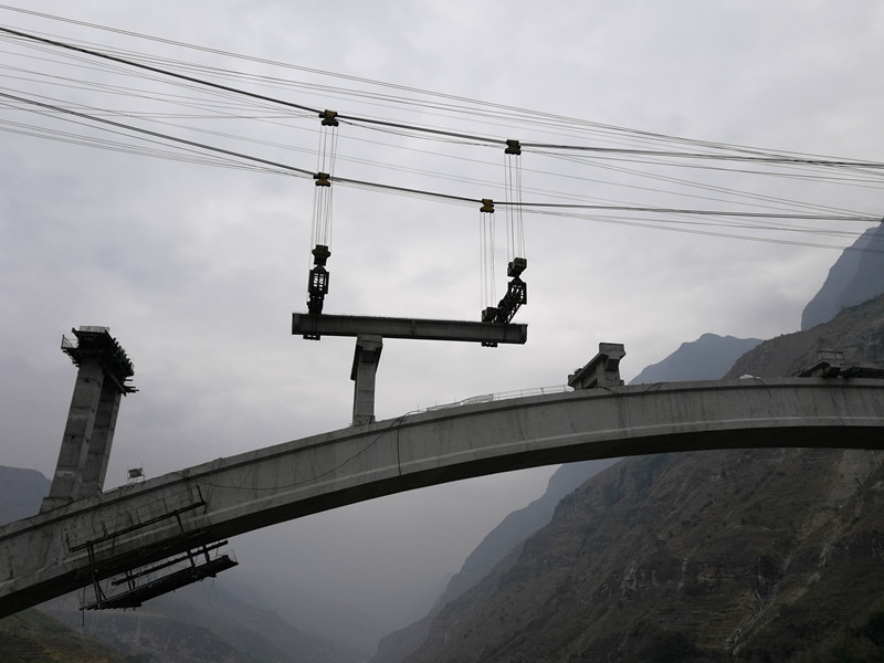 2018年1月13日上午7時(shí)30分,纜索吊裝65噸重的箱梁在經(jīng)過4小時(shí)前行后,于11時(shí)53分平穩(wěn)地將首片箱梁放下,標(biāo)志著涼山布拖金沙江溜索改橋下部結(jié)構(gòu)已全面完工,箱梁吊裝工作正式啟動(dòng)。