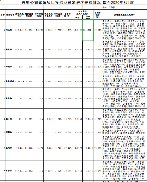 興蜀公司管理項(xiàng)目投資及形象進(jìn)度完成情況(截至2020年8月底)