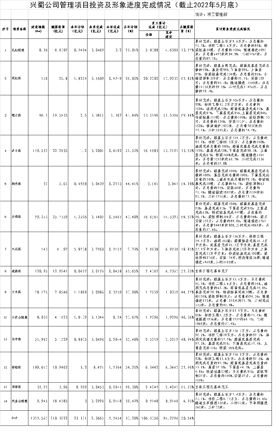 興蜀公司管理項目投資及形象進度完成情況(截止2022年5月底)