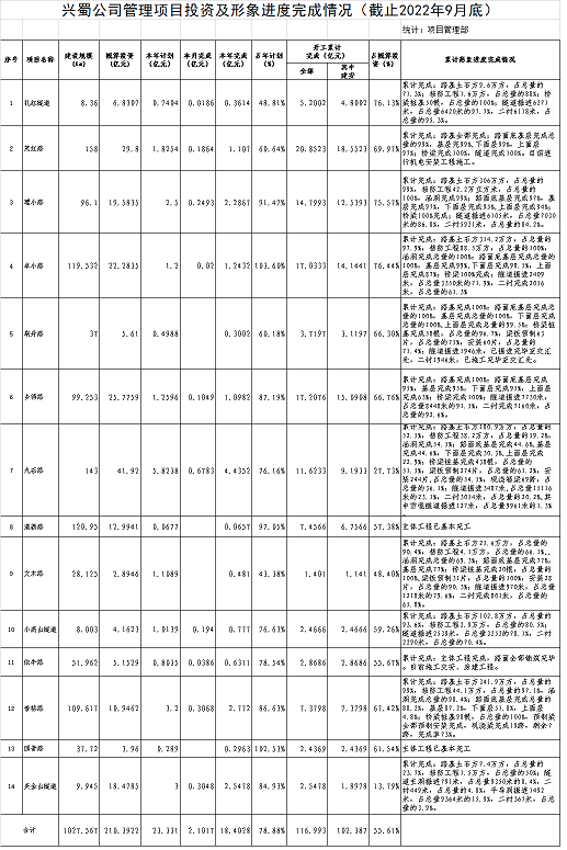 興蜀公司管理項目投資及形象進(jìn)度完成情況(截止2022年9月底)