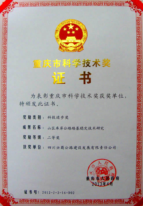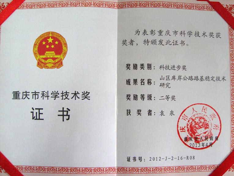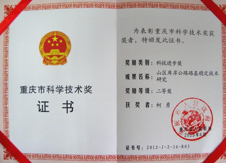 日前,我公司科研課題《山區(qū)庫(kù)岸公路路基穩(wěn)定技術(shù)研究》,榮獲重慶市人民政府2012年度“重慶市科技進(jìn)步獎(jiǎng)”二等獎(jiǎng)。柯勇總經(jīng)理、袁泉總工程師分獲個(gè)人二等獎(jiǎng)。