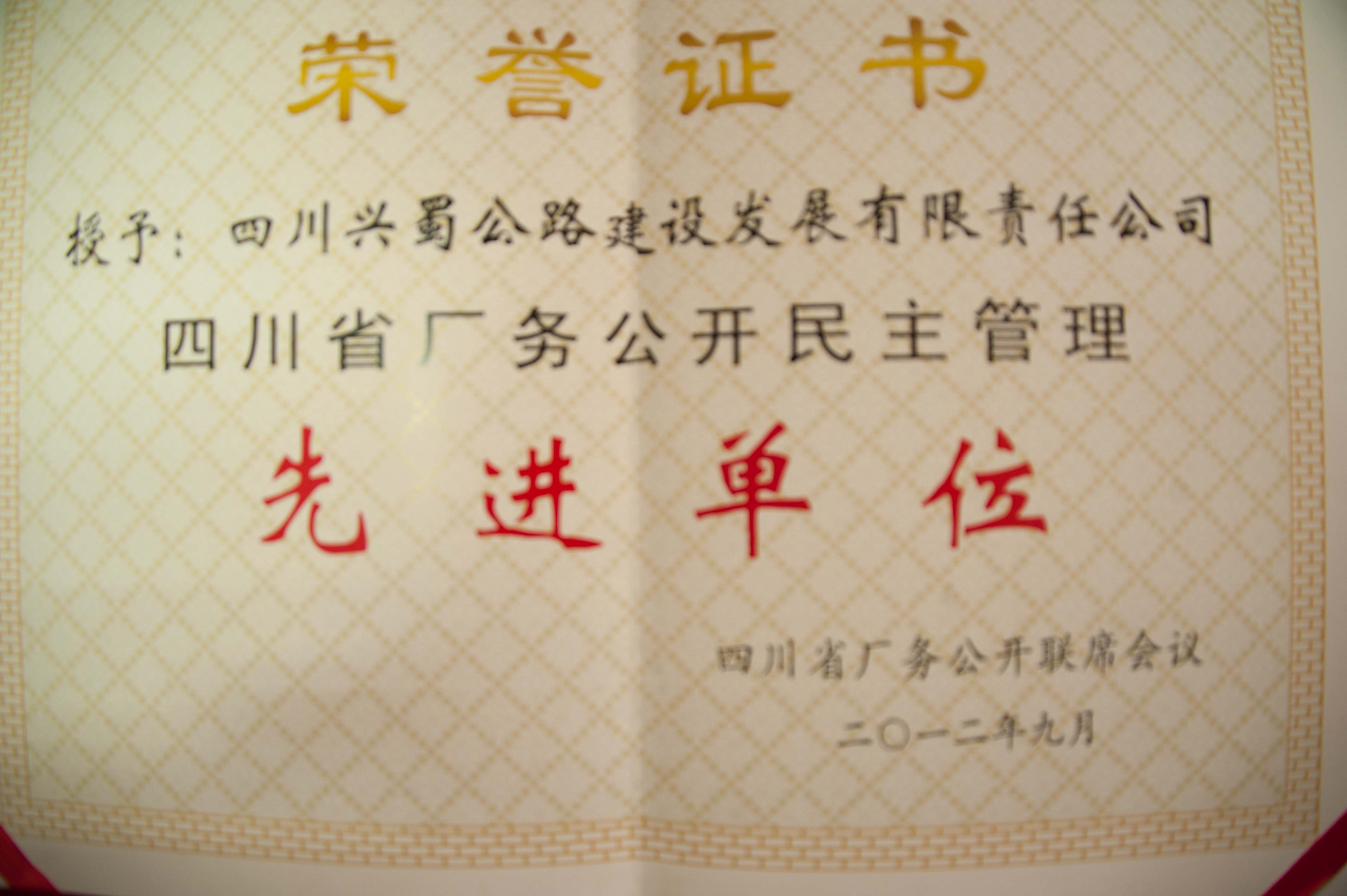 公司日前榮獲“四川省廠務(wù)公開民主管理先進(jìn)單位”榮譽(yù)稱號。